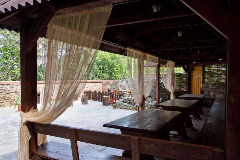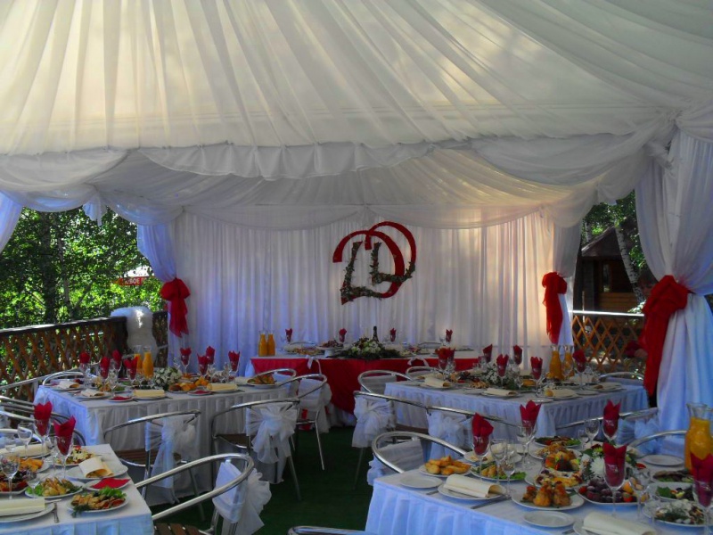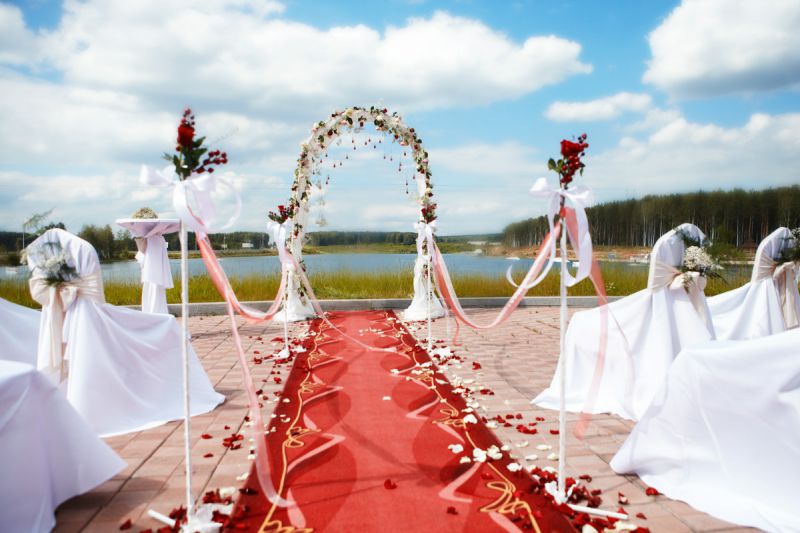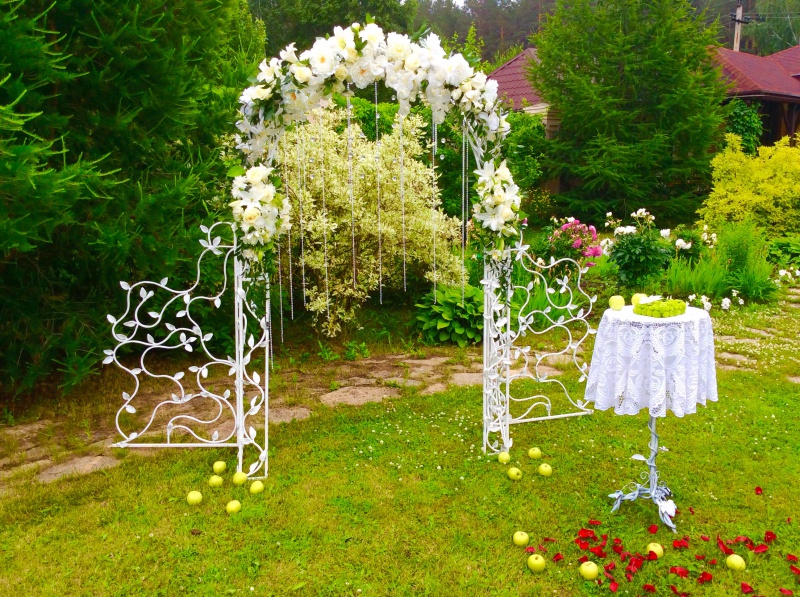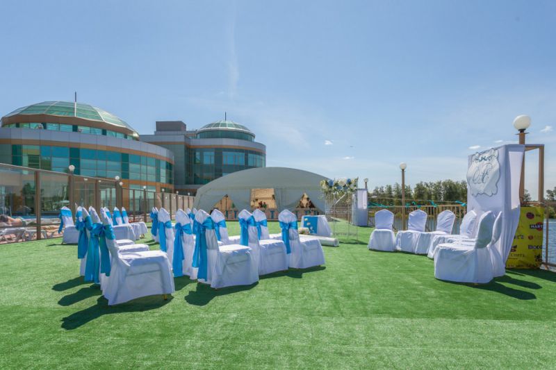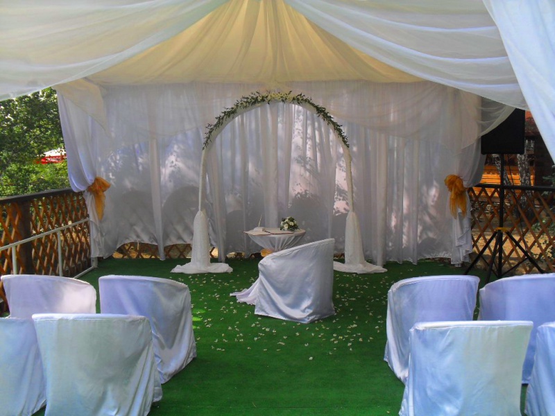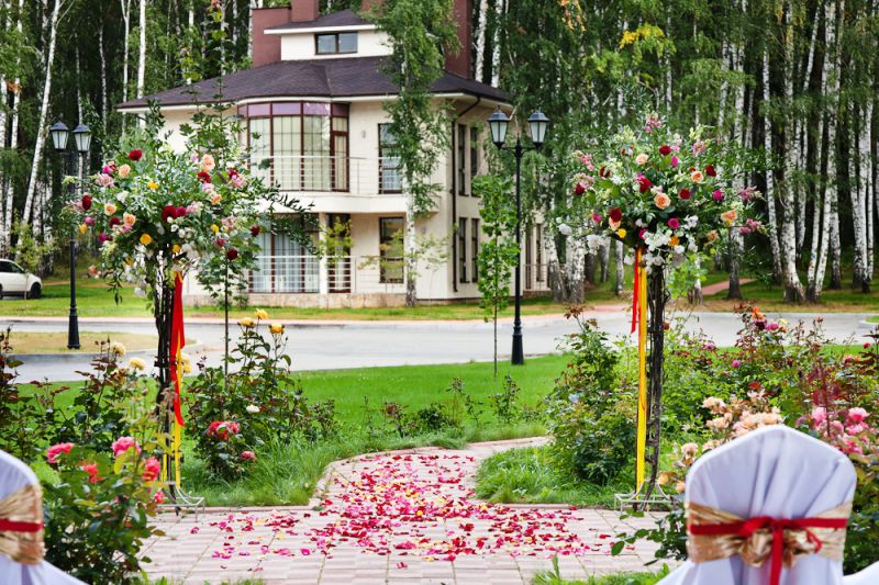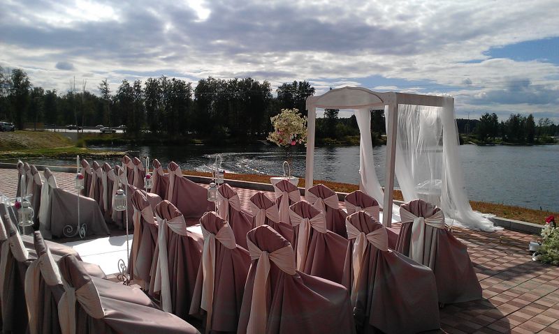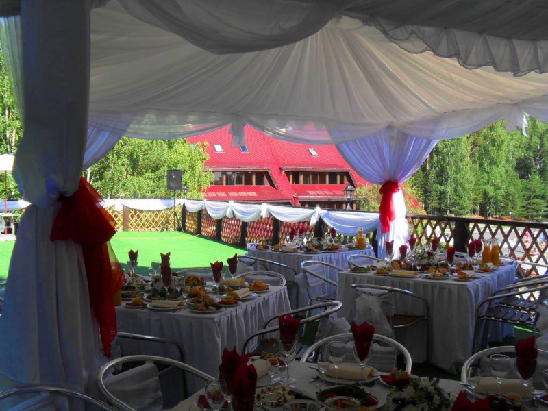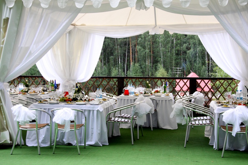 Летняя веранда для проведения выездных регистраций и банкетов на свежем воздухе в окружении зелени.