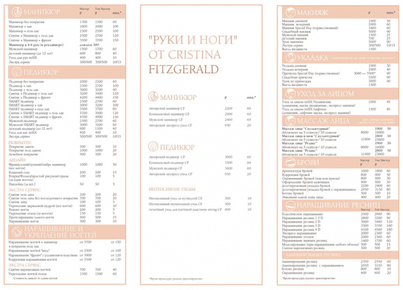 Маникюр без покрытия 1 300 ₽ Маникюр+лак 1 800 ₽ Маникюр+гель лак 2 300 ₽ Снятие+маникюр+гель лак 2 500 ₽ Мужской маникюр 1 500 ₽ Детский маникюр (до 12 лет) 600 ₽ Уход для рук 400 ₽ Авторский маникюр от CHRISTINA FITZGERALD 2 200 ₽ Комплексный маникюр от CHRISTINA FITZGERALD 2 900 ₽ Мужской маникюр от CHRISTINA FITZGERALD 2 400 ₽ Авторский экспресс уход для рук CHRISTINA FITZGERALD 950 ₽ Покрытие гель лаком 1 000 ₽ Покрытие лаком 500 ₽ Лечебное покрытие 500 ₽ Снятие гель лака 200 ₽ Снятие гель